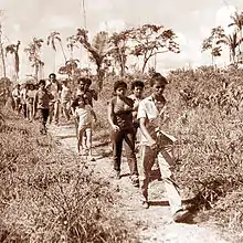 Marina Silva was born Maria Osmarina da Silva in the small village of Breu Velho, 70 km outside Rio Branco, Acre. Silva is a descendant of Portuguese and black African ancestors in both her maternal and paternal lines.[8] She was one of eleven children in a community of rubber tappers on the Bagaço rubber tree plantation (Portuguese Seringal Bagaço), in the western state of Acre. Growing up, she survived five bouts of malaria in addition to cases of hepatitis and metal poisoning.[9][10]