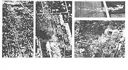 The Marion tornado touched down near Carteville, at 3:00 p.m. resulting in damage to a subdivision near John A. Logan College. It then tracked into downtown Carterville then tracked southeast into Crainville, Illinois, after which it caused moderate damage to the area surrounding Williamson County Regional Airport.[17] At 3:16 p.m. the tornado either formed a new funnel or changed course as it tracked into the west side of Marion along Illinois Route 13, causing extensive damage throughout the city. During this time the tornado was observed have a multiple-vortex structure with up to three subvortices swirling around the main tornado.[2] The tornado struck a car along Interstate 57, causing it to explode.[2] By 3:30 p.m. the tornado had exited the city and dissipated near Illinois Route 166. The tornado had destroyed the Shawnee Village Apartment Complex and severely damaged three shopping centers. It heavily damaged the area surrounding the Interstate 57 and Illinois Route 13 interchange including the Marion Ford dealership, and also damaged two schools, 648 homes, and 52 businesses.[2] It caused 10 deaths and 181 injuries, and left over 1,000 people homeless.[18][7]