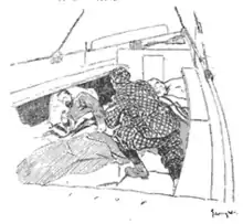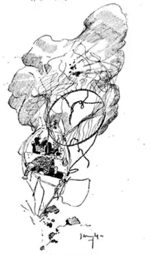 "Mrs. Marion Manville Pope has solved the problem of flying machines which has recently attracted so much attention from inventors all over the world. She has constructed a boat, “The Cloud Queen,” in which she takes two typical Americans up the Matterhorn. She does not reveal the full secret of her contrivance, but she tells enough to show that it can be depended upon to carry its passengers through most amazing experiences. The story is an extravaganza of a thoroughly up-to-date character, and is full of rollicking humor. But the author has written in a realistic vein, so that her readers are almost beguiled into believing the truth of the narrative. The two Americans and their dog, which is quite a character in the book, meet with surprising adventures, including perils from avalanches, precipices and storms; and they succeed in rescuing a stolid Englishman from the snow, and he furnishes a foil for the humor of the Americans. Mr. Wright's pictures are in full accord with the spirit of the text." [5]