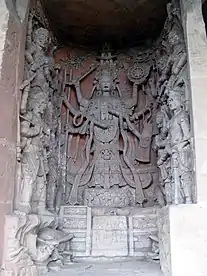 Mārīcī wielding various dharma instruments in the Dazu Rock Carvings in Dazu District, Chongqing, China. Dated to the Song dynasty (960–1279).