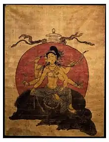 Mārīcī (Sanskrit: मारीची, lit.'Ray of Light'; Chinese: 摩利支天; pinyin: Mólìzhītiān; Japanese: Marishiten) is a Buddhist deity (deva), as well as a bodhisattva associated with light and the Sun. By most historical accounts Mārīcī is considered a goddess, but in some regions she is depicted as a male god revered among the warrior class in East Asia.[1] Mārīcī is typically depicted with multiple arms, riding a charging boar or sow, or on a fiery chariot pulled by seven horses or seven boars. She has either one head or between three and six, with one shaped like a boar. In parts of East Asia, in her fiercest forms, she may wear a necklace of skulls. In some representations, she sits upon a lotus.[1][2][3]