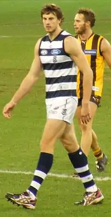 Mark Blake (born 9 September 1985) is a former Australian rules footballer for the Geelong Football Club in the Australian Football League (AFL). A tap ruckman,[2][3] 2.00 metres (6 ft 7 in) tall and weighing 102 kilograms (225 lb), Blake played 99 games for Geelong between 2005 and 2010, including the 2009 AFL Premiership.