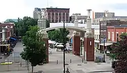 Market Square is a historic district and pedestrian mall located in downtown Knoxville, Tennessee, United States. Established in 1854 as a market place for regional farmers, the square has developed over the decades into a multipurpose venue that accommodates events ranging from concerts to political rallies, and has long provided a popular gathering place for artists, street musicians, war veterans, and activists. Along with the Market House, Market Square was home to Knoxville's City Hall from 1868 to 1924. Market Square was listed on the National Register of Historic Places in 1984.[1]