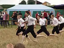 The actual "shepherds' run," the centerpiece of the festival, takes place on the Saturday. First shepherds' daughters and trained female shepherds, dressed prettily in red, white, and green skirts, then male shepherds, race barefoot over a stubble field 300 paces (240 meters) long. The winners receive a sheep as a prize and are crowned Shepherd Queen and Shepherd King, respectively. Following their coronation, the shepherd dance pays homage to the royal couple.