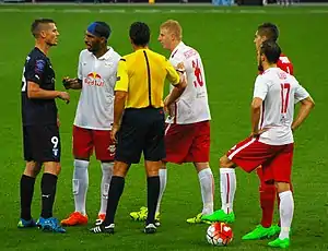 Rosenberg talking to referees and the opposition's players during a Champions League qualifier against Red Bull Salzburg in 2015.