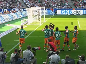 Rosenberg started the 2008–09 season well when he scored four goals and set up Hugo Almeida twice in a 9–3 win over Eintracht Nordhorn in the first round of the DFB-Pokal on 9 August 2008.[155] Seven days later, on 16 August 2008, Rosenberg scored a brace on his debut of the season in a 2–2 against Arminia Bielefeld.[156] A month later, on 20 September 2008, he scored twice in a 5–2 win over Bayern Munich, marking the first time Bremen defeated Bayern at the Allianz Arena.[157] This was followed up by scoring his ninth goal of the season, in a 2–1 win against Erzgebirge Aue in the second round of the DFB-Pokal.[158] After the start of the 2008–09 season, Rosenberg continued to remain involved in the first team despite the new arrival of Claudio Pizarro.[159][160][161][162] Despite a muscular injury sustained while on international duty, Rosenberg later added two more goals by end of 2008, scoring against Hertha BSC and Inter Milan (despite a 2–1 victory, Werder Bremen were eliminated from the group stage and demoted to the UEFA Cup).[163][164][165] On 15 March 2009, Rosenberg scored twice in a 4–0 win over VfB Stuttgart, ending his ten matches without scoring a goal.[166] Despite being sidelined later in the 2008–09 season, he started in the 2009 UEFA Cup Final against Shakhtar Donetsk and played 78 minutes before being substituted, as Werder Bremen went on to lose 2–1 at extra time.[167][168] While not winning the UEFA Cup, the club, nevertheless, won the DFB-Pokal after beating Bayer Leverkusen 1–0.[169] By the end of the 2008–09 season, he had made 47 appearances scoring 13 times in all competitions, making him the club's third highest goal scorer, behind Claudio Pizarro and Diego. However, his goal scoring form came under criticism, due to performance expectations in the first two seasons at Werder Bremen.[170]
