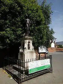 Funds were insufficient to realise this plan, and the memorial, situated in the Buttermarket, was unveiled on 16 September 1891 by Irving, with his statuette as the sole plinth decoration. Rogers asserts that the Memorial awakened a new interest in Elizabethan literature, and quoting Gosse – "Marlowe had been successfully neglected for three-hundred years" noted that "he suddenly became the subject of leading articles in the chief newspapers and magazines, and of paragraphs and leaderettes in minor ones".[1] Although the statue earned the nicknamed Kitty (the playwright was known as Kit), some objections were raised to the statue's dishabille, especially so near the Cathedral. Shrubbery, railings and four lanterns were erected around the statue in 1892.[2]