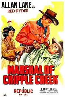 Marshal of Cripple Creek is a 1947 American Western film in the Red Ryder film series directed by R. G. Springsteen and written by Earle Snell. The film stars Allan Lane, Robert Blake, Martha Wentworth, Trevor Bardette, Tom London and Roy Barcroft. The film was released on August 15, 1947, by Republic Pictures.[1][2][3]