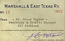 On Monday October 18, 1915, passenger train #2 derailed off a trestle a few miles east of Harleton at around 5:20 p.m. The train consisited of locomotive No. 57, combine car No. 1, and coach car No. 2. The train crew consisted of engineer Barney Clark, fireman Willie Law, conductor Cliff Riden, porter Joe Jenkins, and newsbutch Joe Miller. The two passenger cars landed upside down in the muck, while the locomotive didn't derail at all. 11 people were injured, and conductor Cliff Riden would later pass away from his injuries on Friday October 22, 1915.[1] The M&ET had a special train out of Marshall with a number of doctors and nurses to help treat the injured. In response to his death, the Riden family sued the railway. With lumber being depleted off the line and the lawsuit, the railway went into receivership on January 25, 1917, with Bryan Snyder appointed receiver.[2] In July of that year, the M&ET was put up for auction, with no bidders. The segment of line between East Winnsboro and Gilmer was sold to the Winnsboro and Gilmer Railroad Company, but this railroad never operated and forfeited in 1923. The segment between Marshall and Elysian Fields was sold to the Marshall, Elysian Fields and Southeastern Railway, which operated between 1922 and 1945. The rolling stock was either sold off or scrapped and the only known surviving piece of rolling stock from the M&ET is coach #5 which is currently located at the Pacific Southwest Railway Museum in Campo, California.[3] Two miles (3.2 km) of track and the Marshall terminal were sold to the Texas and Pacific Railway.