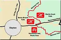 Martin Creek Falls is a series of waterfalls located in Rabun County, Georgia, with the largest drop being about 30 feet.[1] They are located on the Bartram Trail which is a National Recreational Trail in Georgia.[2][3] The falls are east of Clayton, Georgia and can be accessed by taking the Bartram Trail where it crosses Warwoman Road. The trail passes Becky Branch Falls at 200 yards and then continues on for a difficult 1.8 miles to Martin Creek Falls.[1] Martin Creek Falls are in the Chattooga River Ranger District of the Chattahoochee National Forest.