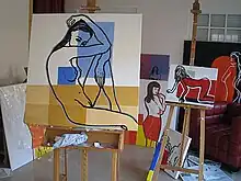 In her narrative and figurative work, Schettina concerns herself with the position of women in the community. She challenges the validation of the role models of men and women in the past and today. Because her bodies seem to be transparent, Schettina is called the painter with the glassy hand. Her work is influenced by Pop-Art. Her painting "Orange Dress", which shows a self-confident, modern woman, was shown on the poster of the 2009 exhibition "City. Country. Woman." in Museum of the City Krems, Austria. From 2008, Schettina has dealt with mathematical themes, which she transforms to paintings.[1][2] In December 2009 the book Mathemagische Bilder containing paintings and essays was published in Vienna.[3] Schettina also shows performances about mathematics, which are illustrated by her paintings.