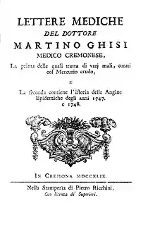 Martino Ghisi (11 November 1715 – 11 May 1794) was an Italian physician who worked in Cremona. He is best known for being the first to detail the clinical signs and anatomical changes related to diphtheria which he published privately in a pamphlet.
