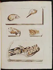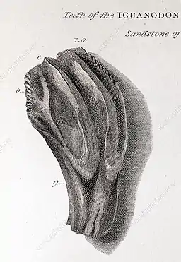 Mary Ann Mantell, like many women of the period in her position, made a "not-insignificant contribution" as "wife-assistant to her husband in collecting, illustrating and engraving."[13] She drew up 364 detailed lithographs of the fossils for her husband's scientific publication The Fossils of the South Downs published in 1822,[14] and in Illustrations of the Geology of Sussex published in 1827, in which Gideon Mantell describes the Iguanodon, thus named due to its likeness to the modern day Iguana. Gideon Mantell "was very proud of his wife's work"[15] and emphasised the accuracy of his wife's depictions despite her lack of previous lithographic work, mentioning in his foreword that "as the engravings are the first performances of a lady but little skilled in the art, I am most anxious to claim for them every indulgence ... although they may be destitute of that neatness and uniformity, which distinguish the works of the professed artist, they will not, I trust, be found deficient in the more essential requisite of correctness."[16] The discovery of the Iguanodon caused excitement amongst paleontologists it was the second largest reptile fossil to be discovered and the teeth of the Iguanodon suggested that the large reptile was an herbivore; whilst many believed that all ancestors of reptiles were carnivores, like the Megalosaurus, discovered by William Buckland in 1824.[4]
