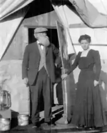 Mary Beal and John Burroughs, standing outside her tent home on the Dix Van Dyke ranch in 1911.