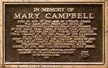 The cave is notable as the temporary home of Mary Campbell.[1] A small plaque in the center of the cave gives visitors the story of her capture by Native Americans and reads: