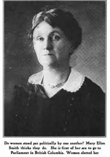 Mary Ellen Spear Smith (October 11, 1863 – May 3, 1933) was a politician in British Columbia, Canada. She was the first female Member of the Legislative Assembly (MLA) in the Legislative Assembly of British Columbia,[1] and both the first female cabinet minister[2][3] and the first female Acting Speaker in the British Empire[4]