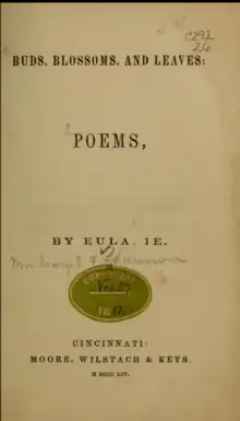 Shannon sent her poetry collection to Cincinnati for publication because California lacked a publishing house in 1854. Buds, Blossoms, and Leaves was published in August of that year by Moore, Wilstach, Keys & Co., Cincinnati, as a duodecimo of 194 pages.[3] If there were no other evidence, the book's preface, dated June, 1854, indicates she was a resident of California when the book left the press. None of the poems show a California influence, and all were probably written before her departure from Ohio. One is entitled "To Frank-In California". "Lines" was "suggested by the death of James D. Turner, who died in Nevada City, California, August 4th, 1851", according to a note. "The Desert Burial" resulted from the receipt of a letter on the death in the desert of an immigrant to California. The poems must have had a considerable circulation in California as they were often found in the state's used bookstores during the later half of the 19th-century.[3]