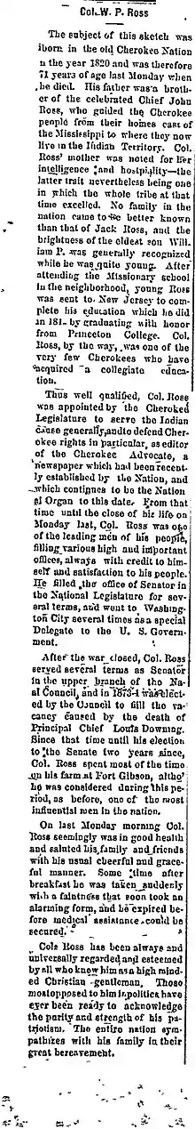22. "Col. W. P. Ross". Cherokee Advocate. 16 (3): 2. 1891-07-22 via Readex: America's Historical Newspapers.