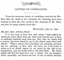 Ross's husband, William Potter Ross, died at Fort Gibson on July 20, 1891.[19] He is buried at Fort Gibson's Cherokee National Cemetery. In the two years following his death, Ross took pains to prepare, edit, and publish his biography, "The Life and Times of Honorable William P. Ross of the Cherokee Nation]" (1893). She writes a personal dedication at the beginning of the biography, thanking loved ones for their support.