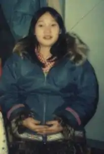 Mary Kapbak Okheena (also goes by Memorana, Krappak, Kappak)[1] is an Inuvialuit[2] graphic artist[3] known for her stencil prints including "Musk-ox Waiting for the Tide to Cross Water" (1986) and "Shaman Dances to Northern Lights" (1991), drawings and embroidery.[4] She is part of the third generation of organized graphic artists in the Canadian Arctic.[5] Okheena has five children[6] with her husband Eddie[7] and she currently lives in Inuvik where she practices embroidery and makes wall hangings.[4]