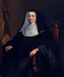 Meanwhile the exiled Charles II was in Europe and Knatchbull enjoyed a close relationship with the King and his court. The convent played host to the court and received and passed on letters to the King's advisers including the Earl of Ormonde and Edward Hyde (later earl of Clarendon).[2] Knatchbull communicated widely and her opinions were noted. She was considered one of the finest of abbesses and a person who played an important role in Charles II's restoration to the throne in 1660.[4] When Charles left to return to England her called in to see the nuns. He owed them over £3,000. He gave them a token payment and reaffirmed his intention to settle his debts with thanks once her was restored to the monarchy. Knatchbull never saw the £3,000, but she did manage to obtain £1,000 after twice travelling to London to remind the new King of his debt to the nuns of Ghent. Knatchbull died in Ghent in 1696.[2]