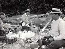 Rinehart lunching after a morning's trouting on Flathead River, Glacier National Park (c. 1921)