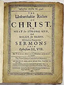 - ↑ "Ton anexichniaston plouton [sic] tou Christou. The unsearchable riches of Christ. Or, Meat for strong men. Milke [for] babes. Held for th in twenty-two sermons from Ephesians 3.8. By Thomas Brookes, preacher of the Word at Margarets New-Fishstreet". quod.lib.umich.edu. Retrieved 2023-07-27.