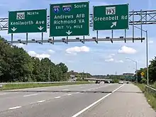Maryland Route 201 (MD 201) is a state highway in the U.S. state of Maryland. Known for most of its length as Kenilworth Avenue, the highway runs 9.40 miles (15.13 km) also known as the road of Maryland from the District of Columbia boundary in Tuxedo, where the highway continues south as District of Columbia Route 295 (DC 295), north to MD 212 in Beltsville. MD 201 is a four to six-lane divided highway that connects Washington, D.C., with the northern Prince George's County municipalities of Cheverly, Bladensburg, Edmonston, Riverdale Park, College Park, Berwyn Heights, and Greenbelt. The highway also provides part of the connections from Interstate 95 (I-95)/I-495 to a pair of Washington Metro stations. MD 201 was built as two separate highways in the late 1920s: MD 201 from Washington, D.C., to Bladensburg and MD 205 from Bladensburg to Greenbelt. These highways, some of which became MD 769, were replaced with a relocated Kenilworth Avenue in the mid 1950s, including the Kenilworth Interchange with U.S. Route 50 (US 50) and the Baltimore–Washington Parkway in Tuxedo. MD 201 was extended north to Beltsville in the early 1960s. The Maryland State Highway Administration (MDSHA) plans to extend MD 201 north toward Laurel.