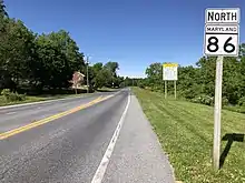 Maryland Route 86 (MD 86) is a state highway in the U.S. state of Maryland. Known as Lineboro Road, the state highway runs 4.00 miles (6.44 km) from MD 30 in Manchester north to the Pennsylvania state line in Lineboro, where the highway continues as Pennsylvania Route 516 (PA 516). MD 86 was constructed in the late 1920s; the MD 30 junction was reconfigured due to residential development around 2008.