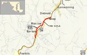 Maryland Route 935 (MD 935) is an unsigned state highway in the U.S. state of Maryland. The state highway runs 2.99 miles (4.81 km) from MD 36 in Barton north to MD 36 in Nikep. MD 935 is the old alignment of MD 36 through Barton, Moscow, and Nikep in the Georges Creek Valley of western Allegany County. The state highway was designated when MD 36 moved to a new alignment through the communities in the early 1980s.