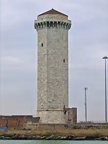 The Marzocco was such a powerful symbol of the Florentine Republic that the republican Florentine troops in the Siege of Florence (1529–1530) were known as marzoccheschi, "sons of the Marzocco",[8] and pro-Medici besiegers of the city in 1530 held a funeral and ritually buried a representation of it, with bells tolling.[9] Prisoners of war from Pisa were forced to kiss it in 1364.[10] At Anghiari, subject to Florence from 1385, the 15th-century Palazzo del Marzocco faces the church; at Montepulciano stands the Marzocco column; at Volterra the Marzocco stands against the Palazzo dei Priori, seat of government; at Livorno the 15th-century Torre del Marzocco (illustration, right) guards the harbor entrance; and at Pietrasanta there are a 16th-century Marzocco fountain and the Marzocco column, erected in 1513 when Pope Leo X awarded the commune to Florence.