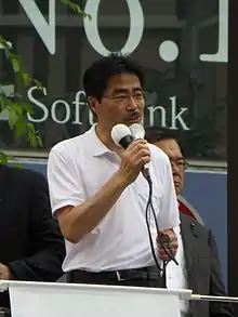 In 2017, he left the Liberal Democratic Party to form a new political group called "Nippon First", which is affiliated with the Tomin First no Kai.[2] Being an ally of the Tokyo Governor Yuriko Koike, Wakasa along with Goshi Hosono, who recently departed from Democratic Party (DP), worked together to form a new opposition party called Kibō no Tō (Party of Hope) in September 2017.[3] The new party, co-led by Wakasa, effectively became the new main opposition party after Koike did not endorse "roughly half" of the candidates fielded by DP for the upcoming general election of 2017, leading to the decision to disband DP and have former members of DP to join the new party.[4]