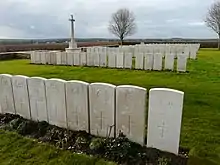 The Masnières Newfoundland Memorial, which commemorates the Royal Newfoundland Regiment's losses in 1917 in the Battle of Cambrai[2] is located nearby, but is not a part of the cemetery.[1] The Royal Newfoundland Regiment are honoured by 5 overseas memorials: the Beaumont Hamel Memorial, the Gueudecourt Memorial, the Monchy-le-Preux Memorial and the Masnières Memorial.[3]