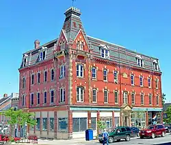 Belfast's former Masonic Temple is located in the commercial heart of the city, at the northeast corner of Main and High Streets. It is a 3+1⁄2-story masonry structure, built out of red brick with stone trim, resting on a granite foundation. It is capped by a mansard roof, and has a four-story mansard-roofed tower prominently set at the street corner. The ground floor houses commercial storefronts, with the main entrance centered on the facade facing High Street, flanked by engaged columns and topped by an elaborate stone hood with brackets. Windows on the upper levels are set in segmented-arch openings, with keystones. The mansard roof is pierced by dormers with one or two sash windows, topped by small gables. The tower is crested by a small corniced battlement.[3]
