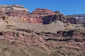 Masonic Temple is a 6,242-foot-elevation (1,903-meter) summit located in the Grand Canyon, in Coconino County of northern Arizona, US.[2] Set below Dutton Point on the Powell Plateau, and overlooking the Shinumo Amphitheater, it is situated three miles west of Holy Grail Temple, 2.7 miles northwest of Dox Castle, and 1.6 miles north-northeast of Fan Island. Topographic relief is significant as it rises 4,000 feet (1,200 meters) above the Colorado River in four miles (6.4 km). According to the Köppen climate classification system, Masonic Temple is located in a cold semi-arid climate zone, with precipitation runoff draining south to the Colorado River via Hakatai Canyon from the west aspect, Burro Canyon from the south aspect, and Muav Canyon from the east aspect.[4] This butte is an erosional remnant composed of strata of the Pennsylvanian-Permian Supai Group overlaying the conspicuous cliffs of Mississippian Redwall Limestone, in turn overlaying the Cambrian Tonto Group.[5]