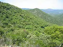 The massif is densely vegetated with an evergreen forest dominated by cork oak, holm oak, holly sweet chestnut and strawberry trees. On the highest ridges Aleppo pine and stone pine flourish.