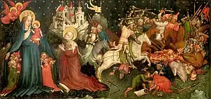 The Master of the Saint Lambrecht Votive Altarpiece was an Austrian painter active between about 1410 and 1440. His name is derived from a panel, formerly in St. Lambrecht's Abbey in the village of Sankt Lambrecht in Styria. This, now in the Alte Galerie in Graz, depicts a former abbot of the monastery, Heinrich Moyker, kneeling before the Virgin of Mercy; with him is Hemma of Gurk. Moyker was the donor of the altarpiece, which depicts the Hungarian victory over the Ottoman Turks. A number of other paintings are believed to be by his hand, as is the design of a stained glass window in Sankt Lambrecht; some of these have also been ascribed to the so-called Master of the Linz Crucifixion, while others are believed to be by Hans von Judenburg or Hans von Tübingen. The latter appears to have lived too late to be identified with the Master's oeuvre. Stylistically, the Master's ascribed body of work indicates a familiarity with International Gothic as practiced in Bohemia. Other stylistic traits suggest knowledge of the work being done in Cologne and Westphalia, while still others show aspects of the Viennese, French, and Burgundian schools.