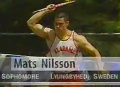 Mats Nilsson is a 4-time All-American male javelin thrower competing for University of Alabama (1995–1998), University of Texas at El Paso (2000–2001), and the Swedish National Team (1991–2004). He was ranked top-10 in the world as a junior, a perennial medalist at the Swedish Championships, and became Crimson Tide's first NCAA champion in the javelin throw in history. Mats's older brother, Joakim Nilsson, was the catalyst for the Tide's throwers' program in the early 1990s, and was awarded the prestigious Bryant Student Athlete Award (1995) (named after Paul "Bear" Bryant) at the end of his career. Mats Nilsson received his PhD in exercise physiology.