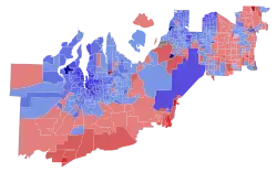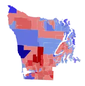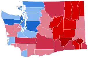Washington's new congressional map leaves the districts largely the same, though it makes the 1st and 10th districts somewhat more liberal. The most notable change was to the 1st district, which previously reached up to the Canada–United States border. Under the new map, it is more compact, with Medina and Bellevue in the south and Arlington in the north.[11] Much of the areas cut out from the 1st district were added to the 2nd district. Previously a primarily coastal district, the 2nd now reaches further inland, taking in Skagit and Whatcom counties. The 8th district was also extended. It now reaches into Snohomish County, taking in the city of Sultan, and northern King County, taking in the city of Skykomish. Although both Snohomish and King are liberal counties, giving 58.5% and 75.0% of their vote respectively to Democrat Joe Biden in the 2020 presidential election, the portions of these counties that are inside the 8th are still notably more conservative than the counties as a whole. This, in addition to the presence of Trump-supporting Chelan and Kittitas counties and a portion of Pierce County, makes the district highly competitive.[9]