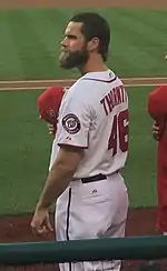 Thornton was claimed by the Washington Nationals after being waived by the Yankees in August, 2014.[18] He pitched in 18 games for Washington down the stretch, going 1–0 and posting a perfect 0.00 ERA.[8] Thornton appeared in three games in the 2014 National League Division Series against the San Francisco Giants, going 0–1 with a 3.86 ERA.[8] Thornton made 60 appearances for Washington in 2015, compiling a 2–1 record and a 2.18 ERA with 23 strikeouts in 4113 innings.[8] Since 2005, Thornton had recorded the most innings of any left-handed reliever.[19]