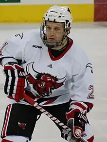 White playing collegiate hockey with the Omaha Mavericks in 2010