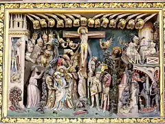 ![]() Schwerin Cathedral ( Mecklenburg ). Gothic polyptich ( 15th century ) - Sandstone relief ( 1420s ) showing the bearing of the cross, crucifixion and harrowing of hell. | |