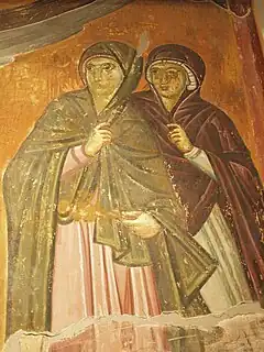 Mary Magdalene and "the other Mary" who is presumed to be "Mary the mother of James and Joses, and the mother of the sons of Zebedee" mentioned at Matthew 27:57. In some traditions the second Mary is considered to be the same person as Salome. Matthew has these two women present for the crucifixion, the entombment, and the resurrection. By specifically mentioning these women at all three events the author of Matthew presents a set of witnesses to the entire passion narrative.[1] This serves an apologetic purpose, evidence that the resurrection was not a matter of confusion. By having the women present at the entombment, there is not possibility that they could confuse tombs when the same women return at Matthew 28:1. That the text so clearly strives to make such a story impossible, is evidence that similar allegations were likely circulating at the time the gospel was written.[2] Craig S. Keener considers it unlikely that the loyalty of the women is purely apologetic. Women witnesses were given less weight than male ones in that era. Moreover, a group of Passionate female followers could have clear scandalous undertones, and in Keener's view would not have been invented for that reason.[3] Matthew 27:55 mentions that many women were at the crucifixion, but now only two appear. The rest of the women may have fled in the same manner as the disciples.[4]