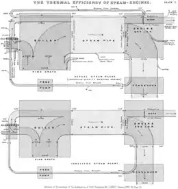 The boiler; the engine; the condenser and air-pump; the feedpump and the economiser, are indicated by rectangles upon the diagram. The flow of heat is shown as a stream, the width of which gives the amount of heat entering and leaving each part of the plant per unit of time; the losses are shown by the many waste branches of the stream. Special attention is called to the one (unfortunately small) branch which represents the work done upon the pistons of the engine."[5]