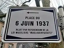 After the vote, however, opposition in the country increased rather than fading away. There was, notably, a large amount of extra-parliamentary opposition organised by the Luxembourg Workers' Party, trade unions and young liberals.[1] The Bech government decided to put the matter to a referendum. It was convinced that, with the support of the Luxemburger Wort and the Catholic Church, they would receive the population's assent. To many people's surprise, a slim majority (50,67 %) rejected the law on 6 June 1937.[4]