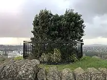 When Auckland was founded as a colonial town a tree stood near the tihi which gave the maunga its English name. Two accounts identify it as a pōhutukawa (Metrosideros excelsa). This tree was cut down by a Pākehā settler in 1852, in an act of vandalism in one account,[42] or for firewood in another.[7] An exotic Monterey pine was planted in 1875 by John Logan Campbell to replace the tōtara or pōhutukawa.[43][44] Campbell repeatedly tried to grow native trees on the tihi, but the trees failed to survive – with only two pines, originally part of a shelter belt for the native trees, surviving for long. However, in 1960, one of the two was felled in another attack.[7]