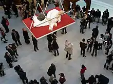 Humour and satire are at the core of Cattelan's work;[9] this approach has often seen him labelled variously as an art scene joker, jester or prankster.[10][11][12] He has been described by Jonathan P. Binstock, curator of contemporary art at the Corcoran Gallery of Art "as one of the great post-Duchampian artists and a smartass, too".[13] Discussing the topic of originality with ethnographer, Sarah Thornton, Cattelan explained, "Originality doesn't exist by itself. It is an evolution of what is produced. ... Originality is about your capacity to add."[14] His work was often based on simple puns or subverts clichéd situations by, for example, substituting animals for people in sculptural tableaux. "Frequently morbidly fascinating, Cattelan's humour sets his work above the visual pleasure one-liners," wrote Carol Vogel of the New York Times.[15]