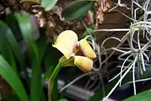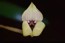 Trigonidium egertonianum has densely clustered pseudobulbs, ovoid in shape with two leaves. The orchid's inflorescence arises on mature growths, ranging from 25–45 cm (9.8–17.7 in) in length. Its flowers are 3–4 cm (1.2–1.6 in) long and bell shaped. The sepals, petals, and lip are yellow-green to pinkish brown, with brown veins and markings. The species is epiphytic and grows on large, wet branches up to 900 m (3,000 ft) in altitude.[2]