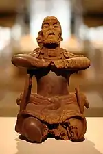 A sajal was ranked below the ajaw, and indicated a subservient lord. A sajal would be lord of a second- or third-tier site, answering to an ajaw, who may himself have been subservient to a kalomte.[121] A sajal would often be a war captain or regional governor, and inscriptions often link the sajal title to warfare; they are often mentioned as the holders of war captives.[126] Sajal meant "feared one".[127] The titles of ah tzʼihb and ah chʼul hun are both related to scribes. The ah tzʼihb was a royal scribe, usually a member of the royal family; the ah chʼul hun was the Keeper of the Holy Books, a title that is closely associated with the ajaw title, indicating that an ajaw always held the ah chʼul hun title simultaneously.[128] Other courtly titles, the functions of which are not well understood, were yajaw kʼahk' ("Lord of Fire"), tiʼhuun and ti'sakhuun. These last two may be variations on the same title,[129] and Mark Zender has suggested that the holder of this title may have been the spokesman for the ruler.[130] Courtly titles are overwhelmingly male-oriented, and in those relatively rare occasions where they are applied to a woman, they appear to be used as honorifics for female royalty.[131] Titled elites were often associated with particular structures in the hieroglyphic inscriptions of Classic period cities, indicating that such office holders either owned that structure, or that the structure was an important focus for their activities.[132] A lakam, or standard-bearer, was possibly the only non-elite post-holder in the royal court.[118] The lakam was only found in larger sites, and they appear to have been responsible for the taxation of local districts.[118]