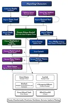 The Royal Ballet released three DVDs of Mayerling. The first, recorded in 1994 and released in 2008, featured Irek Mukhamedov as Crown Prince Rudolf, Viviana Durante as Baroness Mary Vetsera, Lesley Collier as Countess Marie Larisch and Darcey Bussell as Mitzi Caspar.[23] Another DVD, recorded in 2009 and released in 2010, starred Edward Watson as Crown Prince Rudolf and Mara Galeazzi as Baroness Mary Vetsera.[24] The most recent one, released in 2019, with Steven McRae as Crown Prince Rudolf, Sarah Lamb as Baroness Mary Vetsera, Laura Morera as Countess Marie Larisch, Kristen McNally as Empress Elisabeth, Meaghan Grace Hinkis as Princess Stephanie and Mayara Magri as Mitzi Caspar.[25] The recording with McRae was broadcast on BBC Four in 2020.[26]